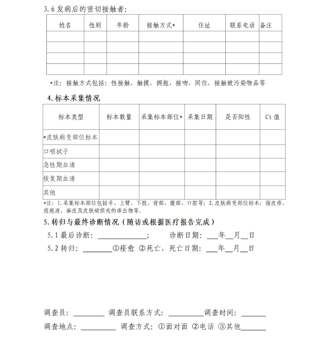 調(diào)查內(nèi)容主要包括病例基本信息、發(fā)病就診情況、臨床表現(xiàn)、轉(zhuǎn)歸及實驗室檢測;發(fā)病前21天內(nèi)與可疑感染來源的接觸史、接觸場所及接觸方式;發(fā)病后至隔離治療前的具體活動地點、與其有皮膚或黏膜直接接觸者,以及發(fā)病前4天內(nèi)與其有性接觸者。