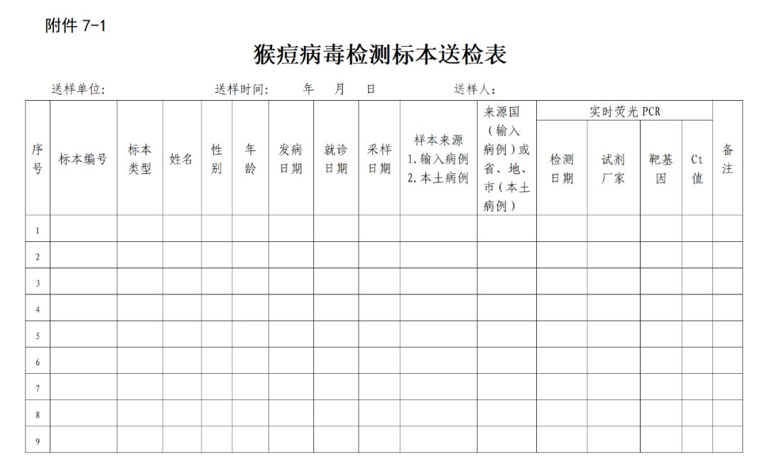 1.送檢標本:病例標本先由省級及以下疾控機構(gòu)進行初步檢測,各省首例猴痘陽性標本應送中國疾控中心病毒病所復核。每個陽性病例至少采集一套標本(皮膚或黏膜病變部位標本、口咽拭子標本及急性期、恢復期雙份血清標本)送中國疾控中心病毒病所檢測。各省級疾控機構(gòu)根據(jù)實際情況制定省內(nèi)樣本送檢、復核流程。