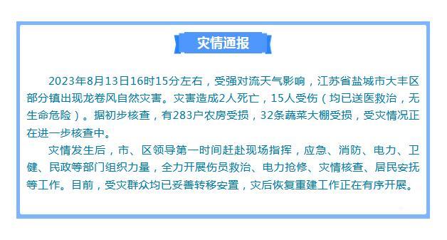 中新網(wǎng)8月13日電 據(jù)江蘇鹽城大豐區(qū)委區(qū)政府官方微信消息,8月13日16時(shí)15分左右,受強(qiáng)對流天氣影響,江蘇省鹽城市大豐區(qū)部分鎮(zhèn)出現(xiàn)龍卷風(fēng)自然災(zāi)害。災(zāi)害造成2人死亡,15人受傷(均已送醫(yī)救治,無生命危險(xiǎn))。據(jù)初步核查,有283戶農(nóng)房受損,32條蔬菜大棚受損,受災(zāi)情況正在進(jìn)一步核查中。