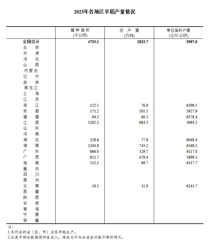 中新網(wǎng)8月23日電 國家統(tǒng)計局網(wǎng)站23日發(fā)布關(guān)于2023年早稻產(chǎn)量數(shù)據(jù)的公告。根據(jù)早稻抽樣調(diào)查結(jié)果推算,2023年全國早稻播種面積、單位面積產(chǎn)量、總產(chǎn)量如下:
