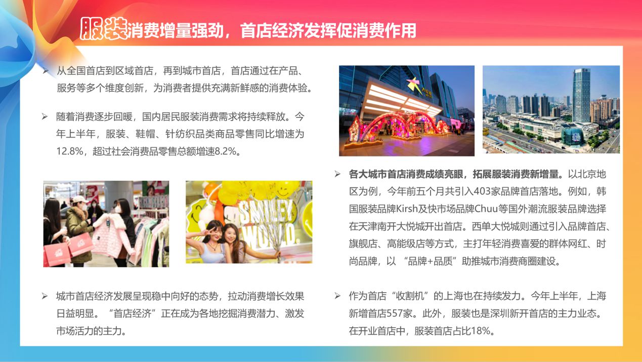 在服裝消費(fèi)方面,隨著消費(fèi)逐步回暖,國(guó)內(nèi)居民服裝消費(fèi)需求將持續(xù)釋放。以北京地區(qū)為例,今年前五個(gè)月共引入403家品牌首店落地。例如,韓國(guó)服裝品牌Kirsh及快市場(chǎng)品牌Chuu等國(guó)外潮流服裝品牌選擇在天津南開大悅城開出首店。西單大悅城則通過(guò)引入品牌首店、旗艦店、高能級(jí)店等方式,主打年輕消費(fèi)喜愛的群體網(wǎng)紅、時(shí)尚品牌,以“品牌+品質(zhì)”助推城市消費(fèi)商圈建設(shè)?!秷?bào)告》認(rèn)為,“首店經(jīng)濟(jì)”正在成為各地挖掘消費(fèi)潛力、激發(fā)市場(chǎng)活力的主力。