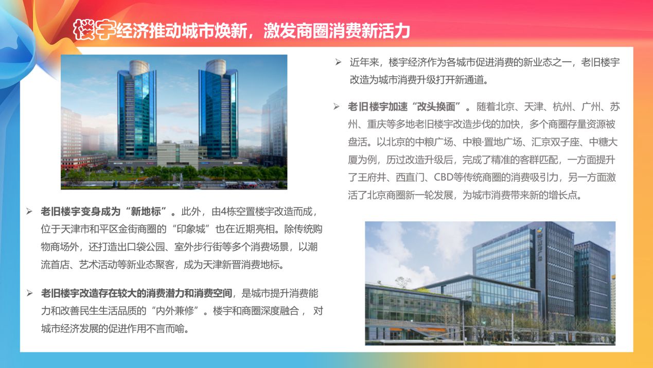 老舊樓宇改造存在較大的消費(fèi)潛力和消費(fèi)空間,是城市提升消費(fèi)能力和改善民生生活品質(zhì)的“內(nèi)外兼修”?!秷?bào)告》梳理指出,隨著北京、天津、杭州、廣州、蘇州、重慶等多地老舊樓宇改造步伐的加快,多個(gè)商圈存量資源被盤活。以北京的中糧廣場(chǎng)、中糧·置地廣場(chǎng)、匯京雙子座、中糖大廈為例,通過(guò)舊改提升、輕(中)資產(chǎn)輸出等方式,打造高端商務(wù)地標(biāo),完成了精準(zhǔn)的客群匹配,一方面提升了王府井、西直門、CBD等傳統(tǒng)商圈的消費(fèi)吸引力,另一方面激活了北京商圈新一輪發(fā)展,推動(dòng)片區(qū)重構(gòu)和能級(jí)提升,為城市消費(fèi)帶來(lái)新的增長(zhǎng)點(diǎn)。