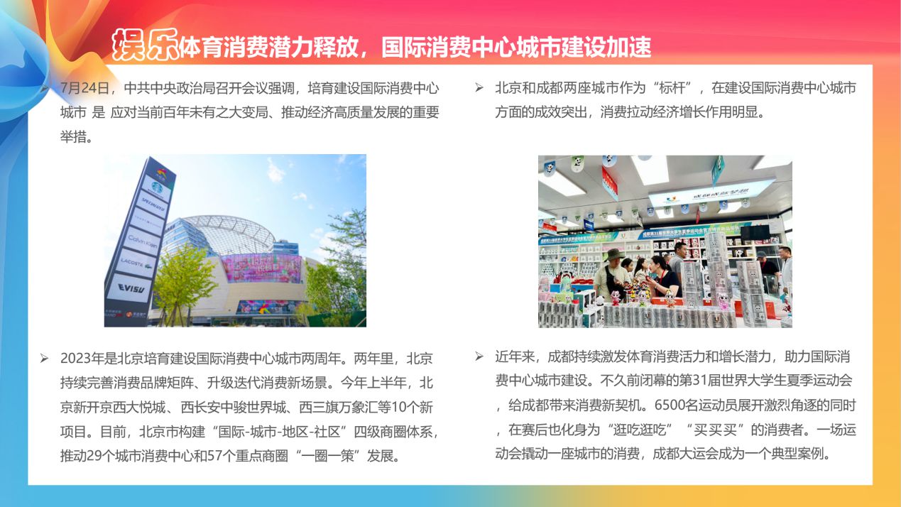 在娛樂(lè)體育消費(fèi)方面,北京、成都兩座城市作為“標(biāo)桿”,在建設(shè)國(guó)際消費(fèi)中心城市方面的成效突出,消費(fèi)拉動(dòng)經(jīng)濟(jì)增長(zhǎng)作用明顯。以北京為例,2023年是北京培育建設(shè)國(guó)際消費(fèi)中心城市兩周年。兩年里,北京持續(xù)完善消費(fèi)品牌矩陣、升級(jí)迭代消費(fèi)新場(chǎng)景。今年上半年,北京新開京西大悅城、西長(zhǎng)安中駿世界城、西三旗萬(wàn)象匯等10個(gè)新項(xiàng)目。目前,北京市構(gòu)建“國(guó)際-城市-地區(qū)-社區(qū)”四級(jí)商圈體系,推動(dòng)29個(gè)城市消費(fèi)中心和57個(gè)重點(diǎn)商圈“一圈一策”發(fā)展。