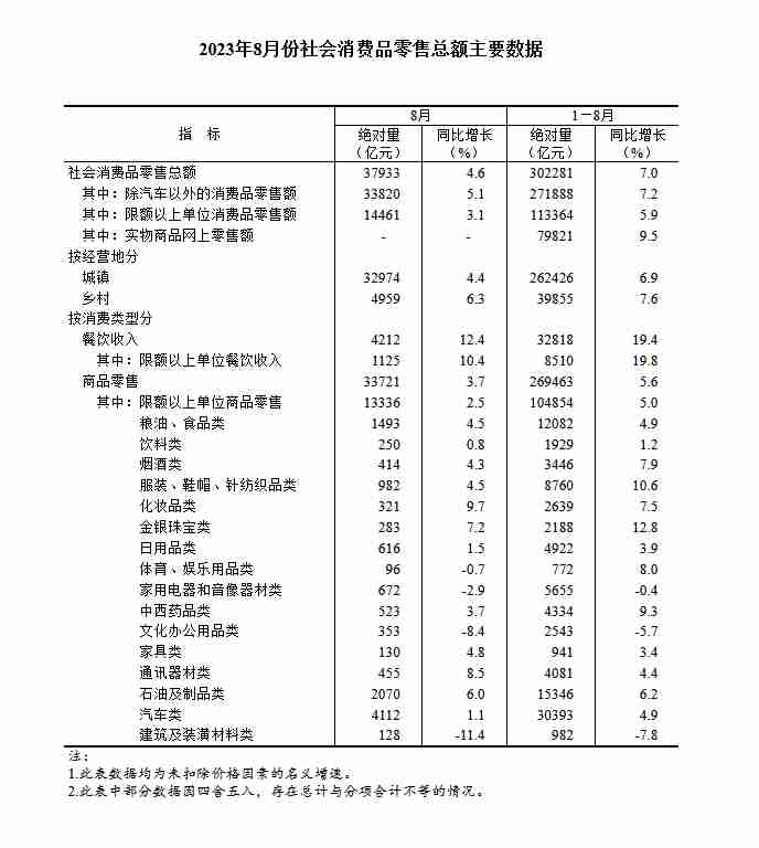 國(guó)家統(tǒng)計(jì)局:2023年8月份社會(huì)消費(fèi)品零售總額增長(zhǎng)4.6%