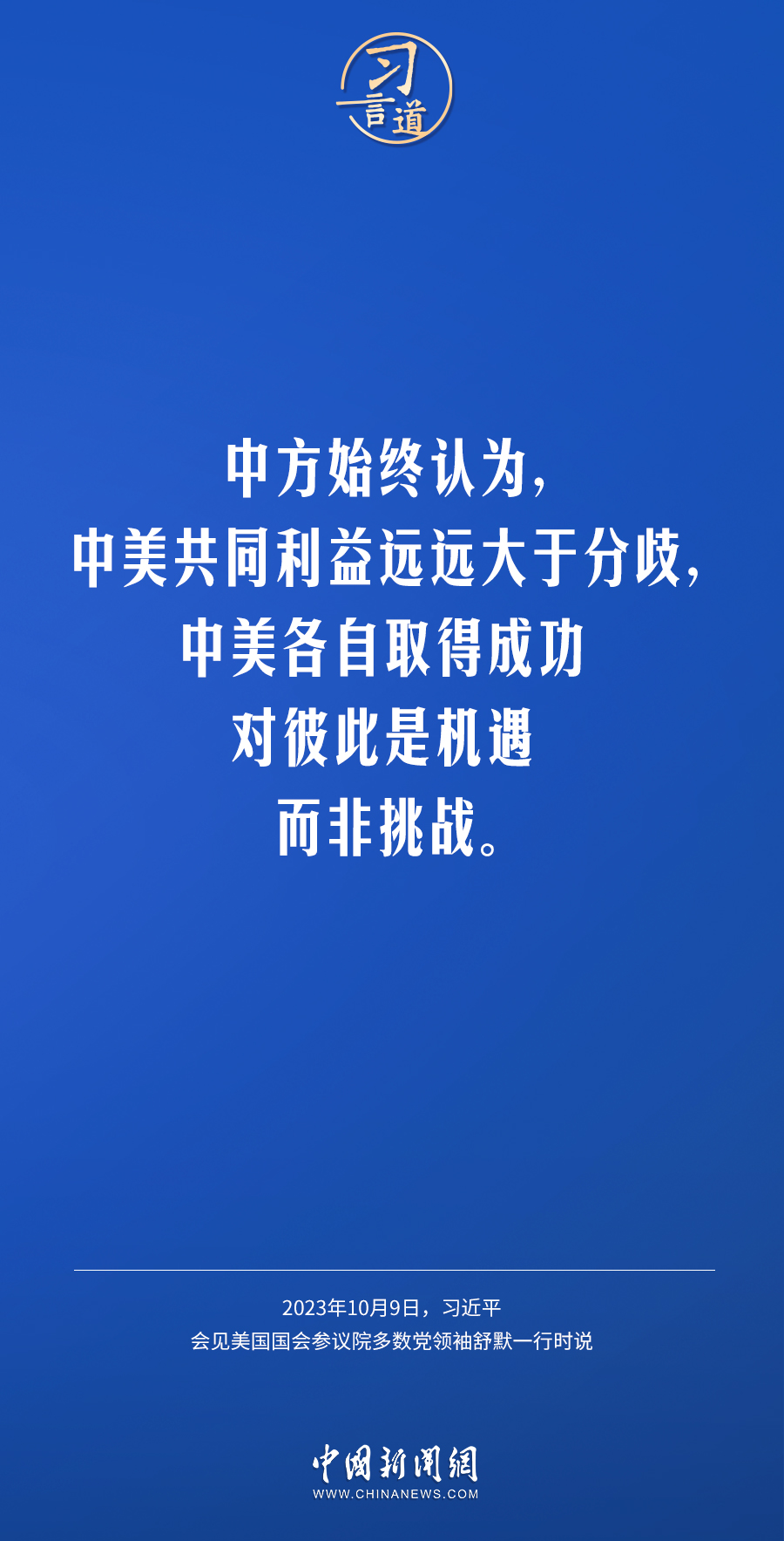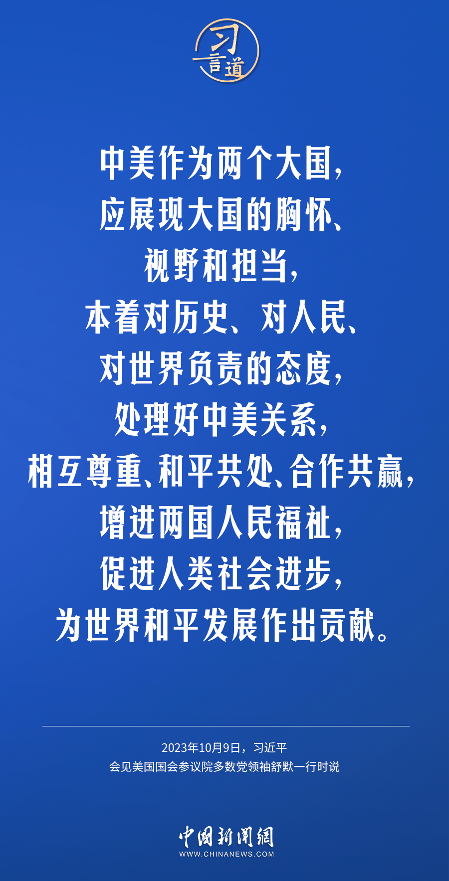 10月9日下午,國家主席習(xí)近平在人民大會(huì)堂會(huì)見美國國會(huì)參議院多數(shù)黨領(lǐng)袖舒默率領(lǐng)的美國國會(huì)參議院兩黨代表團(tuán)。習(xí)近平指出——