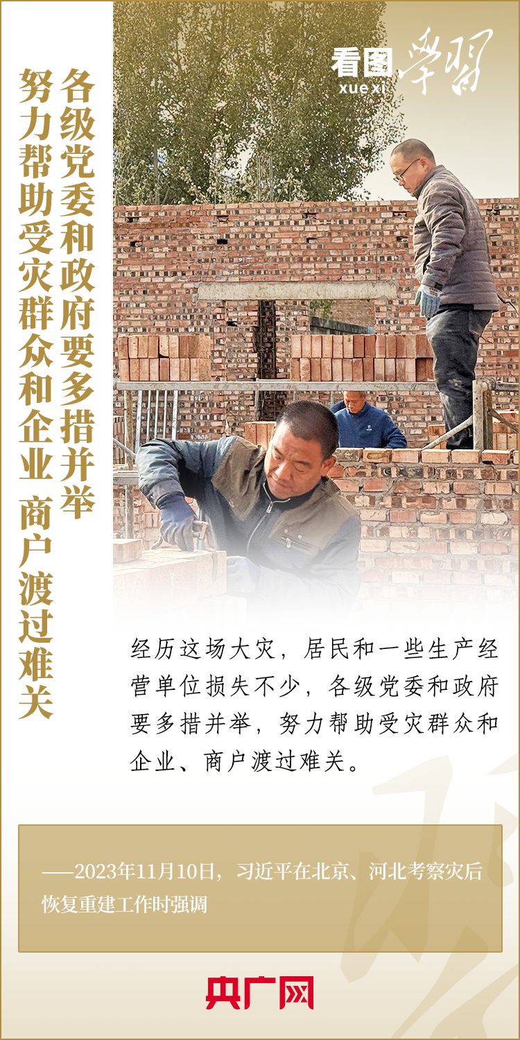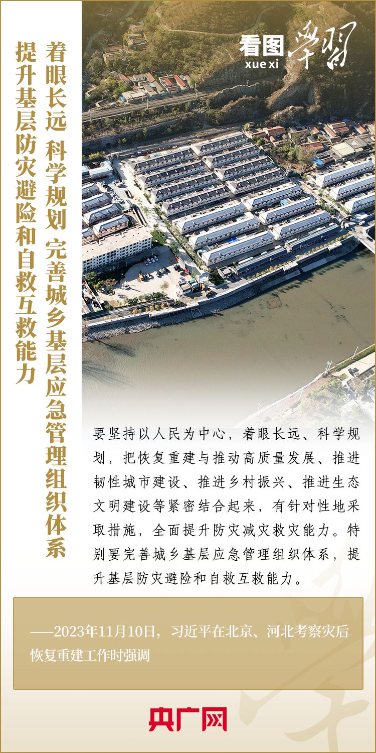 11月10日,習近平總書記在北京、河北考察災后恢復重建工作。總書記深入學校、社區(qū)、村莊、水利工程工地,實地察看村容村貌,了解基礎設施恢復建設提升等情況,要求有關部門堅持以人民為中心,堅持系統(tǒng)觀念,著眼長遠、科學規(guī)劃,把恢復重建與推動高質(zhì)量發(fā)展、推進韌性城市建設、推進鄉(xiāng)村振興、推進生態(tài)文明建設等緊密結(jié)合起來,有針對性地采取措施,再接再厲抓好災后恢復重建,確保廣大人民群眾安居樂業(yè)、溫暖過冬。