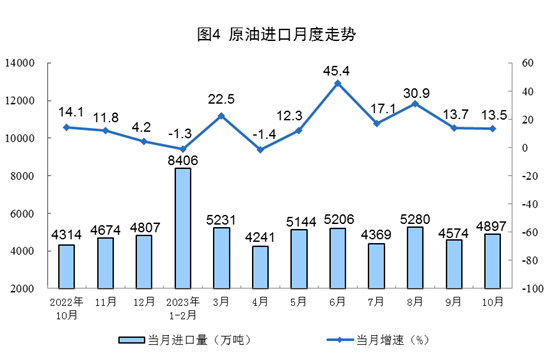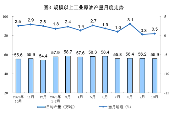 原油生產(chǎn)增速略有加快,進(jìn)口保持較快增長(zhǎng)。10月份,生產(chǎn)原油1733萬噸,同比增長(zhǎng)0.5%,增速比9月份加快0.2個(gè)百分點(diǎn),日均產(chǎn)量55.9萬噸。進(jìn)口原油4897萬噸,同比增長(zhǎng)13.5%,增速比9月份放緩0.2個(gè)百分點(diǎn)。