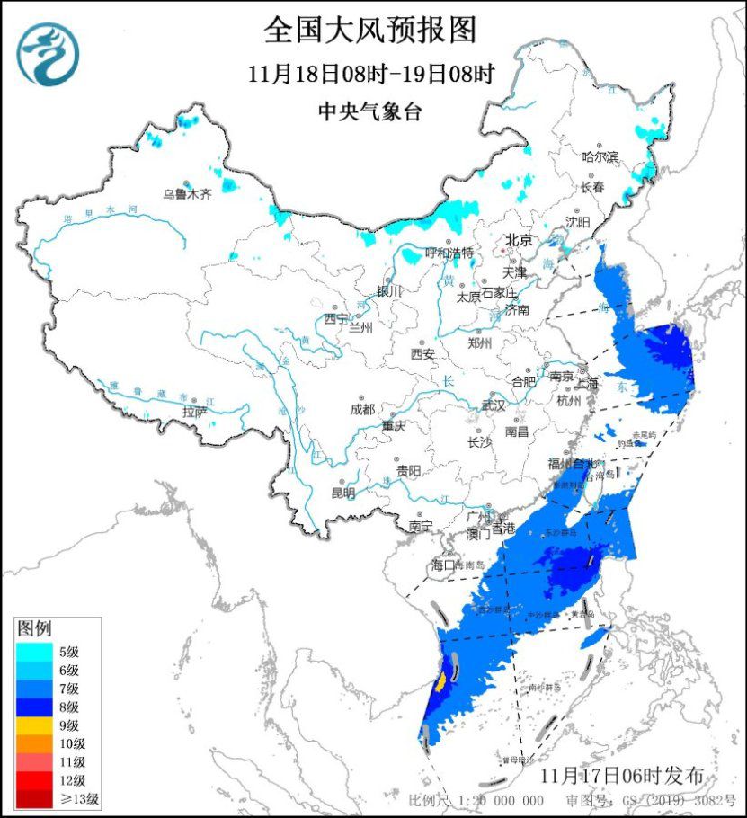 11月17日08時至18日08時,內(nèi)蒙古中東部、東北大部、河北北部、山東半島東部等地將有5~6級、陣風7~8級的大風;渤海、渤海海峽、黃海大部海域、東海大部海域、臺灣海峽、臺灣以東洋面、巴士海峽、南海大部海域?qū)⒂?~8級、陣風9~10級的大風。11月18日08時至19日08時,內(nèi)蒙古中東部、黑龍江東部、吉林東部等地將有5~6級、陣風7~8級的大風;黃海東部海域、東海東北部海域、臺灣海峽、臺灣以東洋面偏南海域、巴士海峽、南海大部海域?qū)⒂?~8級、陣風9~10級的大風。中央氣象臺11月17日06時繼續(xù)發(fā)布大風藍色預警。