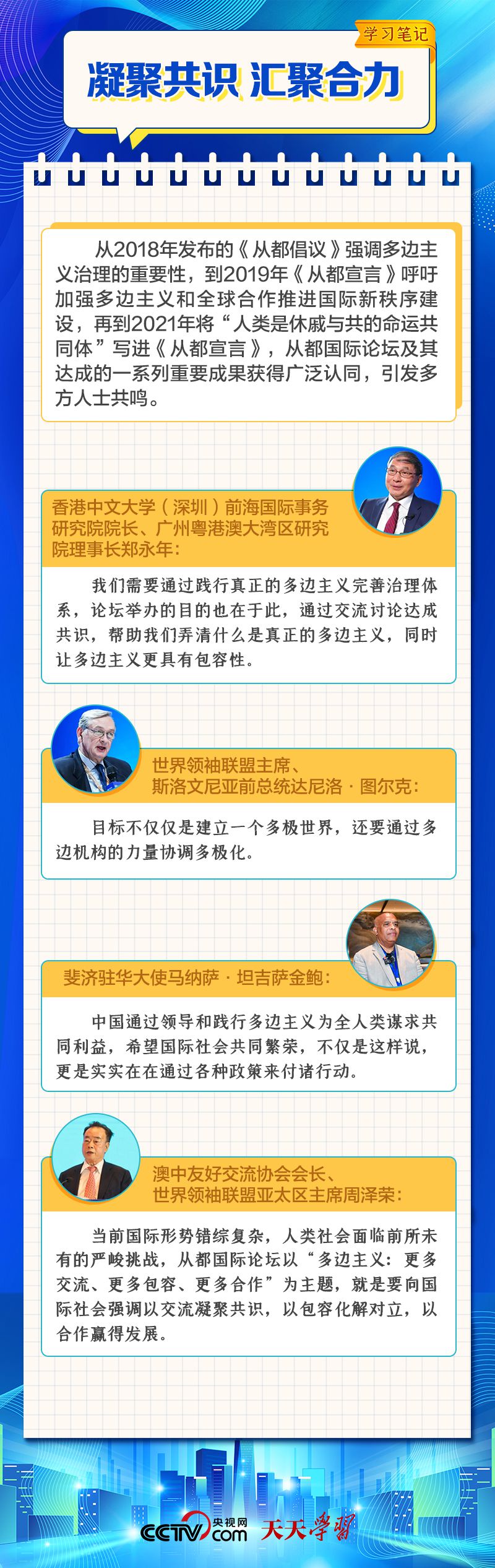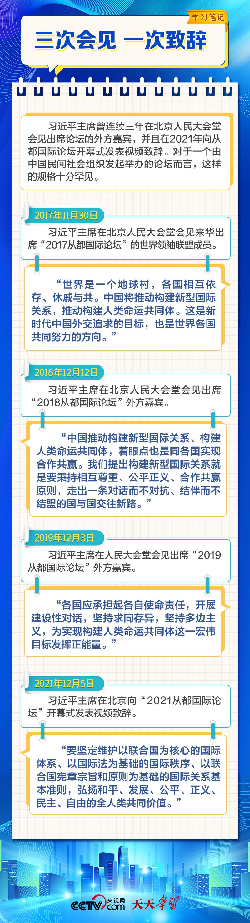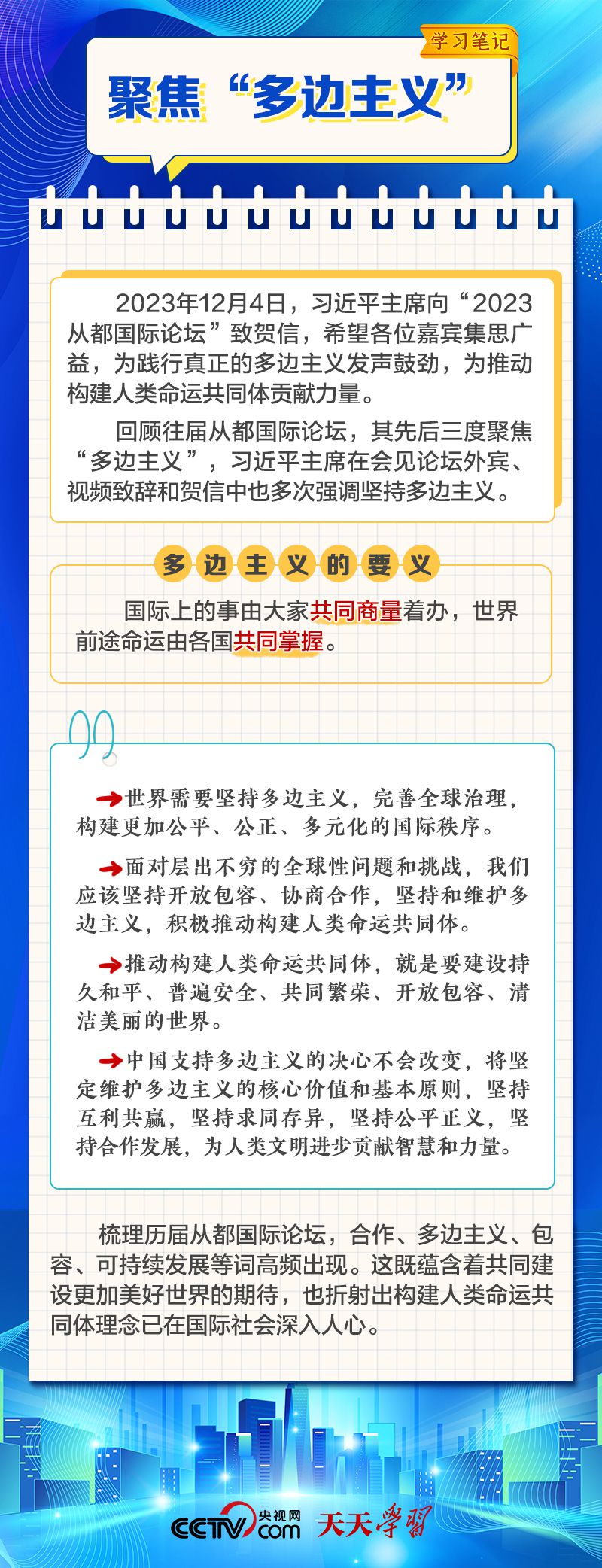 天天學(xué)習(xí) 12月4日,習(xí)近平主席在致“2023從都國際論壇”的賀信中強(qiáng)調(diào),面對前所未有的世界之變、時代之變和歷史之變,人類社會必須團(tuán)結(jié)起來,堅(jiān)持互學(xué)互鑒、開放包容、合作共贏,弘揚(yáng)全人類共同價值,共同建設(shè)更加美好的世界。