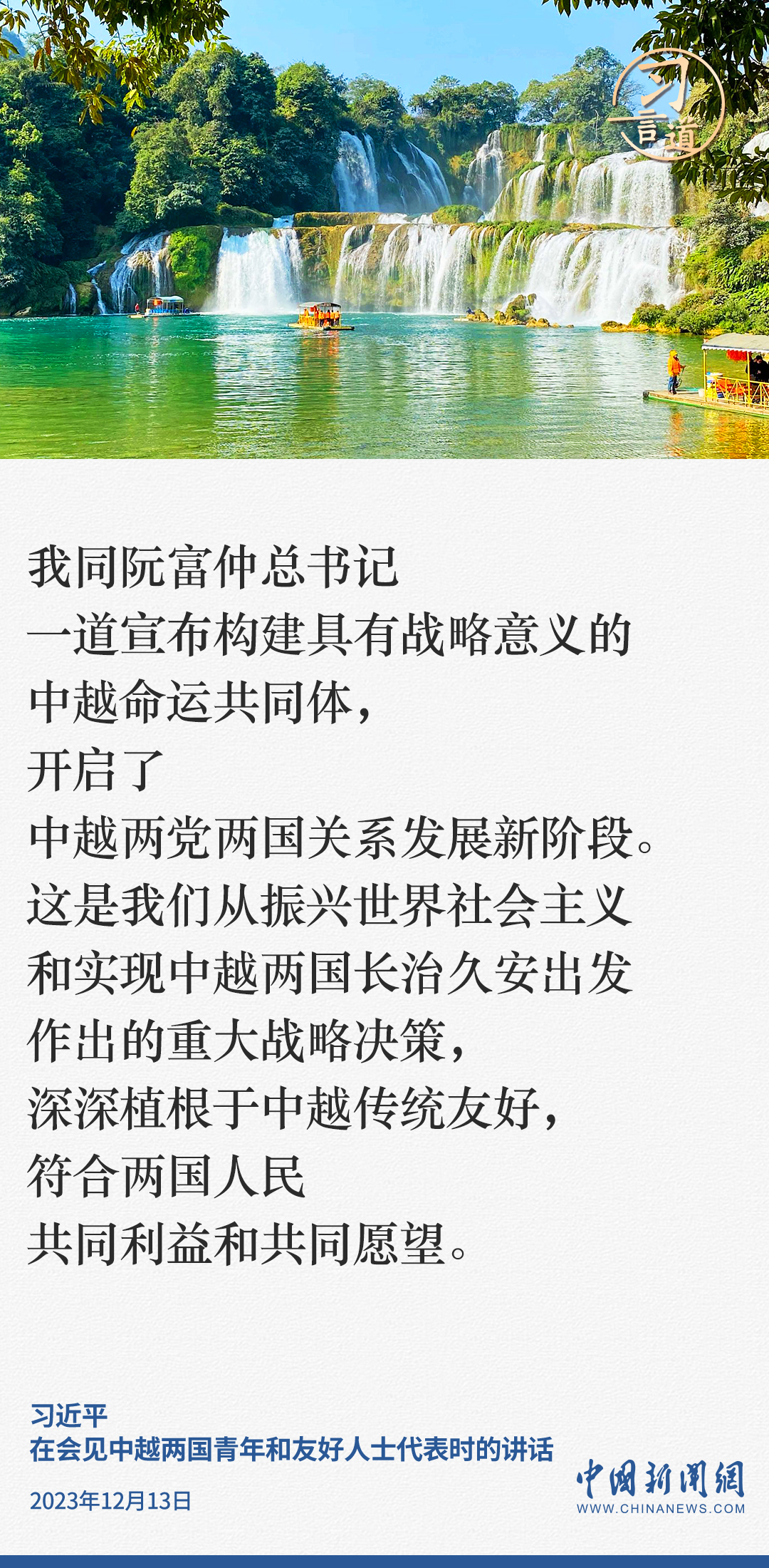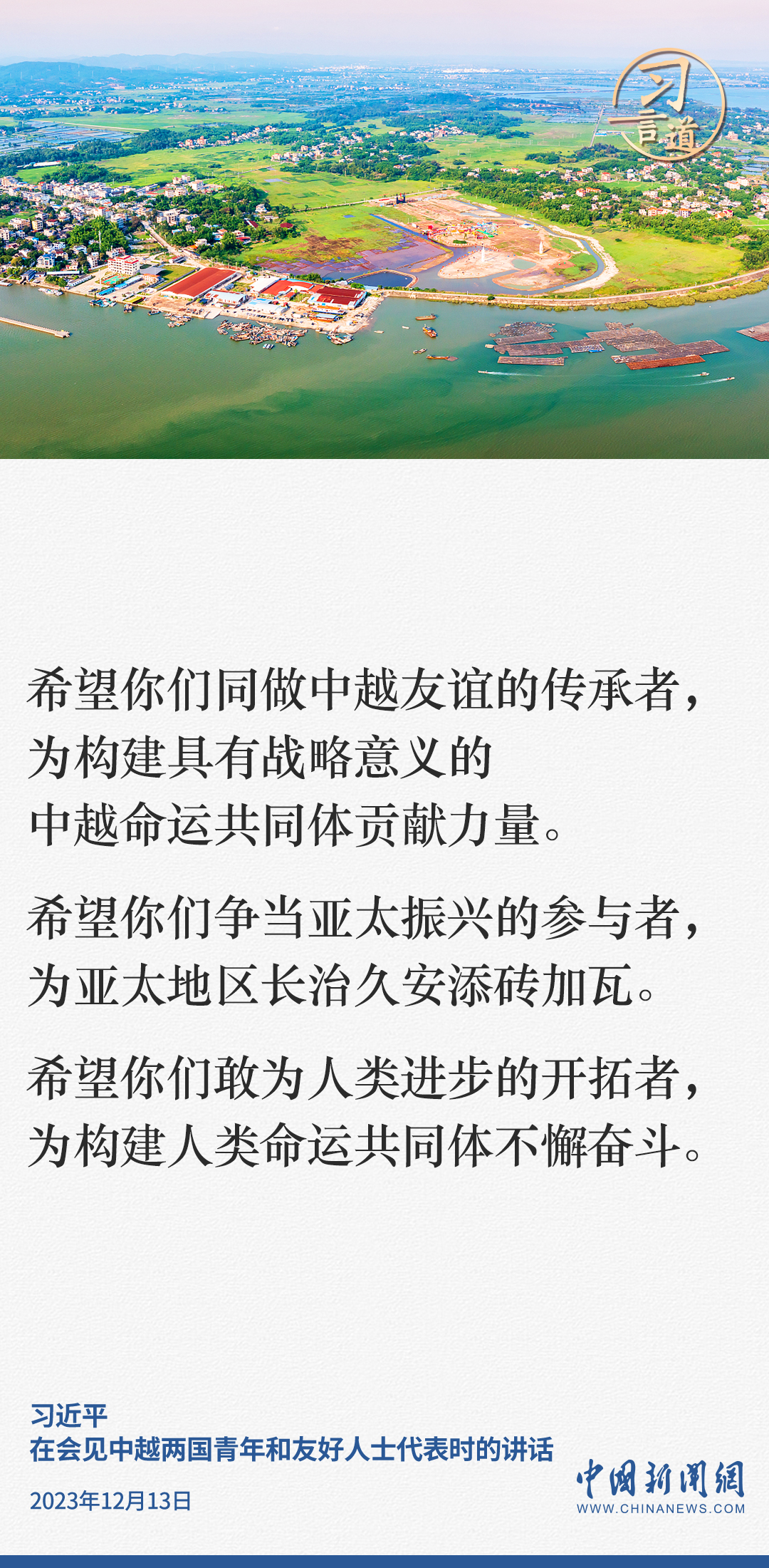 當?shù)貢r間12月13日下午,中共中央總書記、國家主席習近平和夫人彭麗媛在河內(nèi)同越共中央總書記阮富仲夫婦共同會見中越兩國青年和友好人士代表。習近平指出——