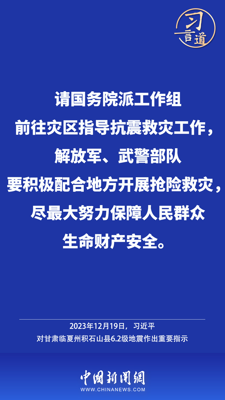 北京時(shí)間12月18日23時(shí)59分,甘肅臨夏州積石山縣發(fā)生6.2級(jí)地震,震源深度10公里。地震發(fā)生后,中共中央總書記、國(guó)家主席、中央軍委主席習(xí)近平高度重視并作出重要指示——
