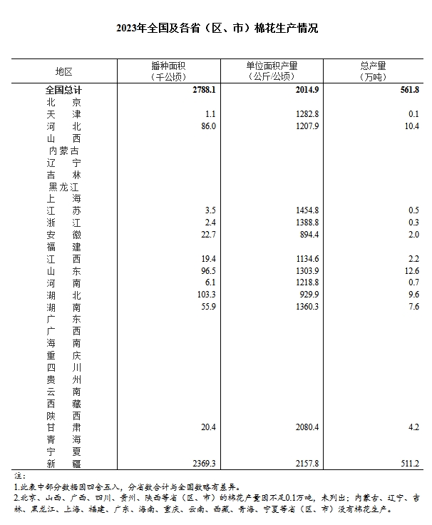 國(guó)家統(tǒng)計(jì)局:2023年全國(guó)棉花總產(chǎn)量561.8萬噸