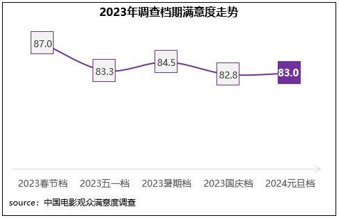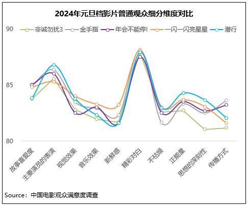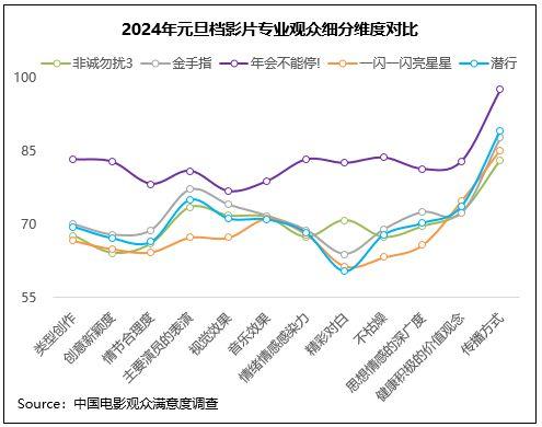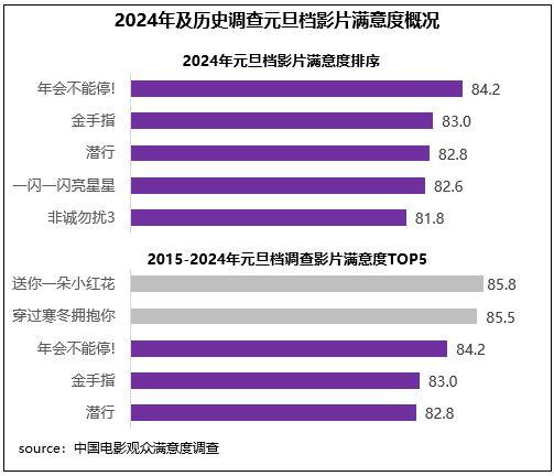 中國電影觀眾滿意度調(diào)查 2024年元旦檔調(diào)查結(jié)果顯示,元旦檔電影觀眾滿意度得分83.0分,環(huán)比增長0.2分。檔期以多元化且高契合度的影片供給陪伴觀眾跨年,得到了較高的滿意度評價(jià),5部影片中有4部進(jìn)入歷史調(diào)查19部元旦檔影片的滿意度前十,喜劇《年會(huì)不能停!》以84.2分領(lǐng)銜,《金手指》83.0分居第二位,《潛行》《一閃一閃亮星星》均超82分,《非誠勿擾3》超81分。