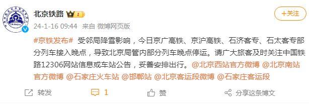 受鄰局降雪影響,中國鐵路北京局管內(nèi)部分列車晚點(diǎn)停運(yùn)