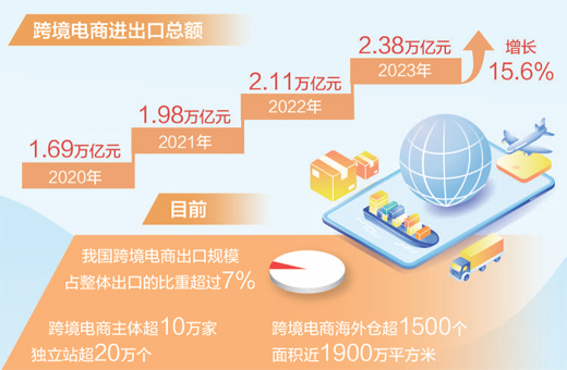 據(jù)海關(guān)測算,2023年,我國跨境電商進出口總額2.38萬億元,增長15.6%。其中,出口1.83萬億元,增長19.6%;進口5483億元,增長3.9%??缇畴娚炭焖侔l(fā)展,既滿足了國內(nèi)消費者多樣化個性化需求,又助力我國產(chǎn)品通達全球,成為外貿(mào)發(fā)展的重要動能。