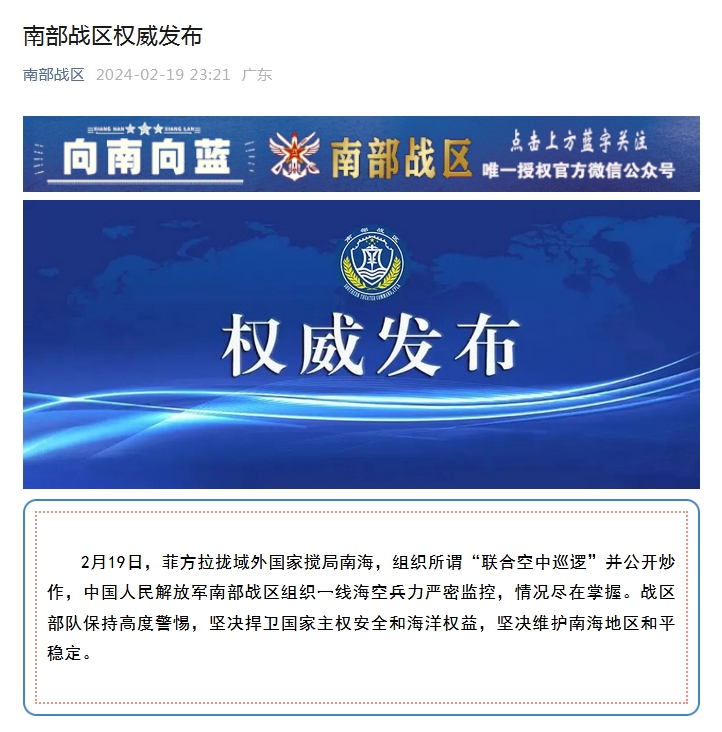 中新網(wǎng)2月19日電 據(jù)南部戰(zhàn)區(qū)微信公眾號消息,2月19日,菲方拉攏域外國家攪局南海,組織所謂“聯(lián)合空中巡邏”并公開炒作,中國人民解放軍南部戰(zhàn)區(qū)組織一線海空兵力嚴密監(jiān)控,情況盡在掌握。戰(zhàn)區(qū)部隊保持高度警惕,堅決捍衛(wèi)國家主權(quán)安全和海洋權(quán)益,堅決維護南海地區(qū)和平穩(wěn)定。
