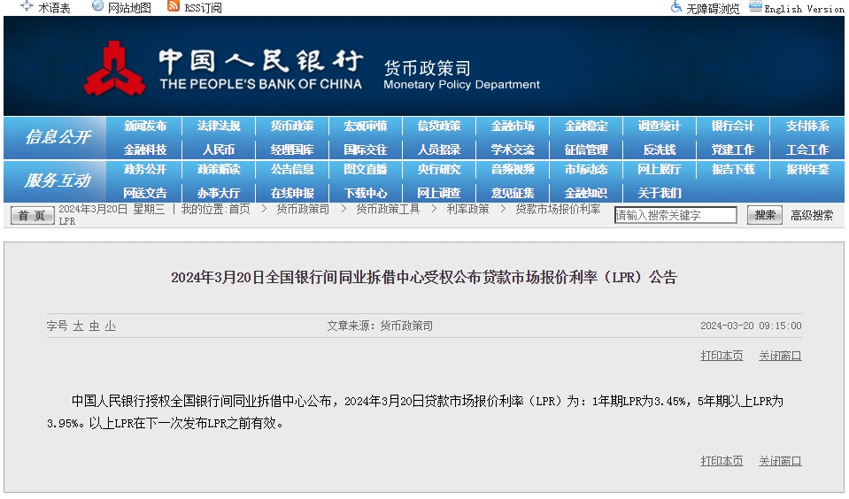 中新網(wǎng)3月20日電 據(jù)中國人民銀行網(wǎng)站消息,中國人民銀行授權(quán)全國銀行間同業(yè)拆借中心公布,2024年3月20日貸款市場報(bào)價(jià)利率(LPR)為:1年期LPR為3.45%,5年期以上LPR為3.95%。以上LPR在下一次發(fā)布LPR之前有效。3月LPR與2月保持一致,未作調(diào)整。