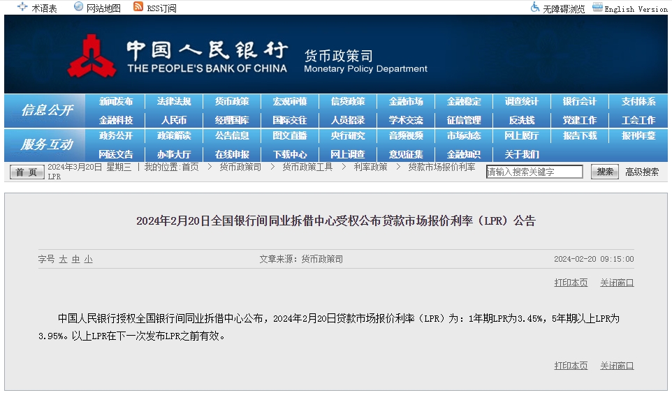 2024年3月貸款市場報(bào)價(jià)利率(LPR)保持不變