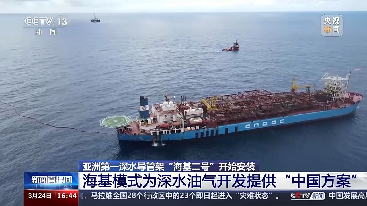 總臺央視記者 古峻嶺:這里是位于深圳東南方向240多公里處的流花油田海域,我們現(xiàn)在看到的這個大家伙,就是搭乘亞洲最大下水駁船——海洋石油229的?;柹詈?dǎo)管架。它相當(dāng)于海上平臺穩(wěn)穩(wěn)矗立在海底的“大長腿”,用鋼量接近于一整個“鳥巢”國家體育館。它是從廣東珠海出發(fā),經(jīng)過40多個小時的長距離拖航,剛剛抵達這一片施工海域。目前正在進行海上安裝前最后的準(zhǔn)備工作。