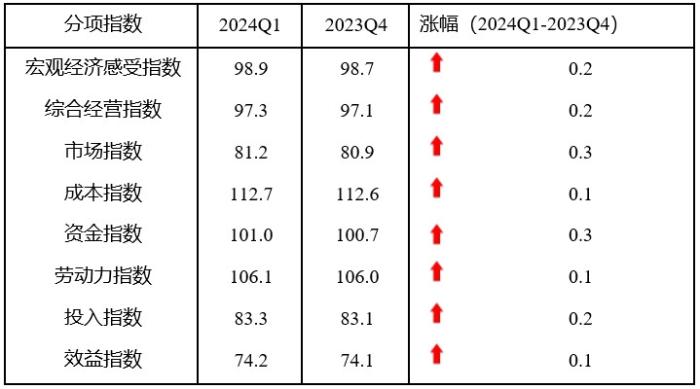 分項(xiàng)指數(shù)全面上升。一季度,宏觀經(jīng)濟(jì)感受指數(shù)、綜合經(jīng)營指數(shù)、市場指數(shù)、成本指數(shù)、資金指數(shù)、勞動(dòng)力指數(shù)、投入指數(shù)和效益指數(shù)均止跌回升,環(huán)比分別上升0.2、0.2、0.3、0.1、0.3、0.1、0.2和0.1點(diǎn)。資金指數(shù)和勞動(dòng)力指數(shù)處于景氣臨界值100以上,宏觀經(jīng)濟(jì)感受指數(shù)、綜合經(jīng)營指數(shù)、市場指數(shù)、投入指數(shù)和效益指數(shù)均處于景氣臨界值100以下,效益指數(shù)一直處于最低位。