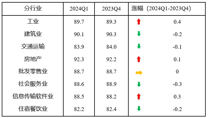 分行業(yè)指數(shù)3升1平4降。一季度,工業(yè)、房地產(chǎn)業(yè)和信息傳輸計(jì)算機(jī)服務(wù)軟件業(yè)指數(shù)比上季度分別上升0.4、0.1和0.3點(diǎn),批發(fā)零售業(yè)指數(shù)持平,建筑業(yè)、交通運(yùn)輸郵政倉儲業(yè)、社會服務(wù)業(yè)和住宿餐飲業(yè)指數(shù)比上季度分別下降0.2、0.1、0.3和0.2點(diǎn),社會服務(wù)業(yè)指數(shù)降幅較大。8個(gè)分行業(yè)指數(shù)均處于景氣臨界值100以下。