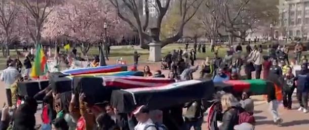 俄羅斯《消息報(bào)》發(fā)布的視頻中,一些集會(huì)人員抬著蓋有烏克蘭、伊拉克、敘利亞等國國旗的“棺材”,以此指代美國外交政策的“受害者”。