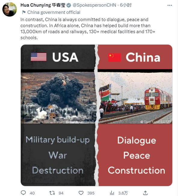 華春瑩接著在第二條推文中發(fā)了一張中美對(duì)比圖,圖中顯示美國沉迷于軍事建設(shè)、戰(zhàn)爭和破壞。“相比之下,中國始終堅(jiān)持對(duì)話、和平、建設(shè)。僅在非洲,中國就援建了1.3萬多公里公路和鐵路、130多個(gè)醫(yī)療設(shè)施、170多所學(xué)校。”華春瑩說。