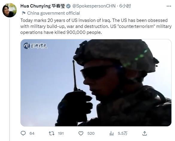 華春瑩在第一條推文中轉(zhuǎn)發(fā)了關(guān)于美國發(fā)動(dòng)伊拉克戰(zhàn)爭的一個(gè)調(diào)查視頻,并配文稱,“今天是美國入侵伊拉克20周年。美國一直沉迷于軍事建設(shè)、戰(zhàn)爭和破壞。美國的‘反恐’軍事行動(dòng)已造成90萬人死亡。”