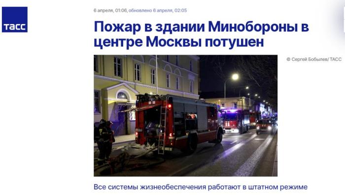 中新網(wǎng)4月6日電 據(jù)塔斯社報(bào)道,當(dāng)?shù)貢r(shí)間5日晚間,俄羅斯國(guó)防部位于莫斯科茲納門卡大街的一棟辦公大樓內(nèi)出現(xiàn)起火冒煙的情況,目前火勢(shì)已被撲滅,沒有人員受傷。