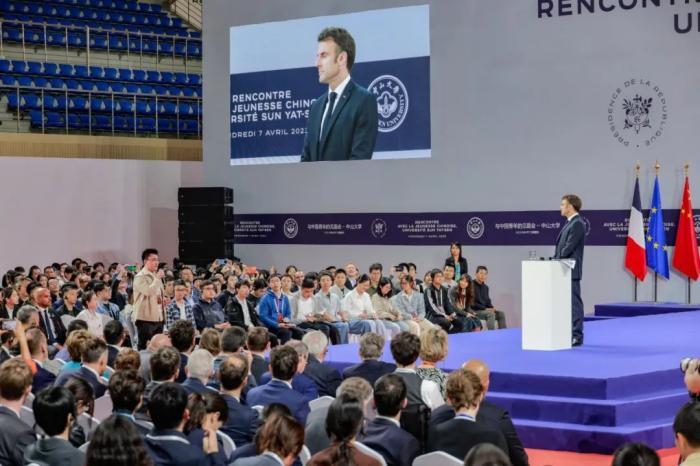 在中山大學南校園體育館,馬克龍舉行與中國青年的見面會,作了簡短演講并回答學生提問。