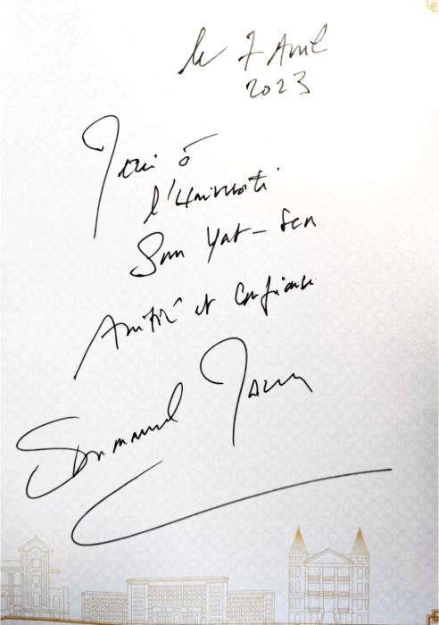 臨別之時,馬克龍留下感言,為中山大學題字:“感謝中山大學的友誼與信任。埃馬紐埃爾·馬克龍,2023年4月7日?!?/p>