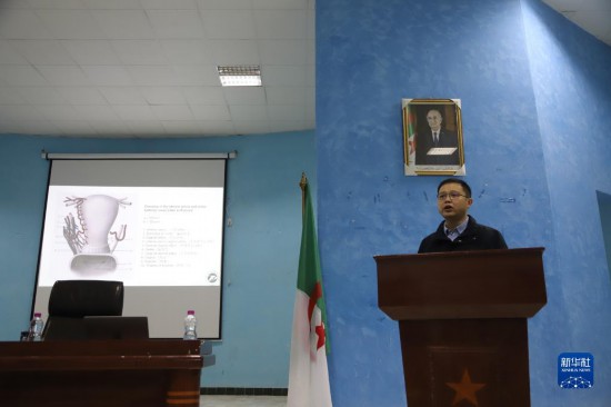 3月7日,在阿爾及利亞塞提夫婦幼醫(yī)院,中國援阿醫(yī)療隊(duì)醫(yī)生朱濤為當(dāng)?shù)刈≡横t(yī)師、醫(yī)學(xué)院學(xué)生等做講座。新華社發(fā)(中國援阿醫(yī)療隊(duì)供圖)