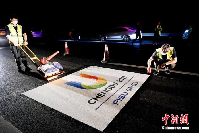資料圖:圖為成都大運(yùn)會專用車道地標(biāo)設(shè)立現(xiàn)場。中新社記者 安源 攝