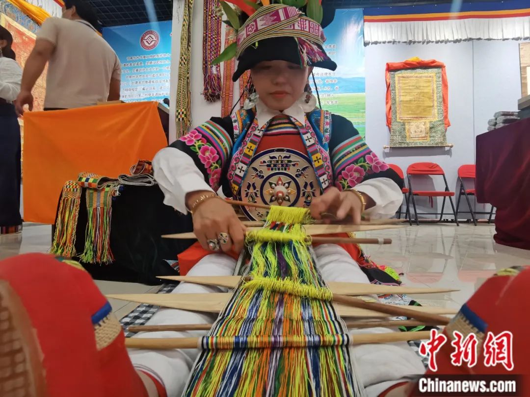 2022年6月,甘肅省張掖市,甘肅甘南藏族自治州舟曲縣藏族姑娘,展示省級(jí)非遺織錦帶。閆姣 攝