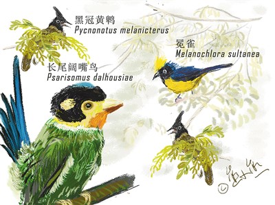 長尾闊嘴鳥、黑冠黃鵯、冕雀,參賽隊(duì)員用漫畫展示在弄崗觀鳥的收獲。
