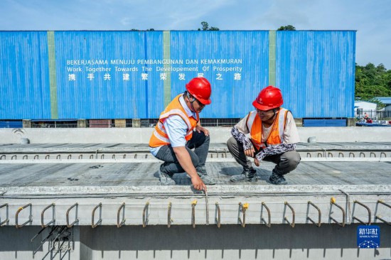 4月26日,工人在馬來(lái)西亞吉蘭丹州的馬東鐵項(xiàng)目一分部制梁場(chǎng)工作。新華社記者 朱煒 攝