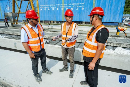 4月26日,在馬來(lái)西亞吉蘭丹州的馬東鐵項(xiàng)目一分部制梁場(chǎng),技術(shù)主管鄧友志(右)和馬來(lái)西亞本地青年員工鄧德緯討論生產(chǎn)情況。五月初的馬來(lái)西亞烈日炎炎,中馬共建“一帶一路”的標(biāo)志性項(xiàng)目——馬來(lái)西亞?wèn)|海岸鐵路(馬東鐵)建設(shè)如火如荼。十支由中馬兩國(guó)員工組成的青年突擊隊(duì)活躍在全長(zhǎng)600多公里的馬東鐵沿線(xiàn)建設(shè)現(xiàn)場(chǎng),用汗水和擔(dān)當(dāng)抒寫(xiě)屬于這個(gè)時(shí)代的青春篇章。新華社記者 朱煒 攝