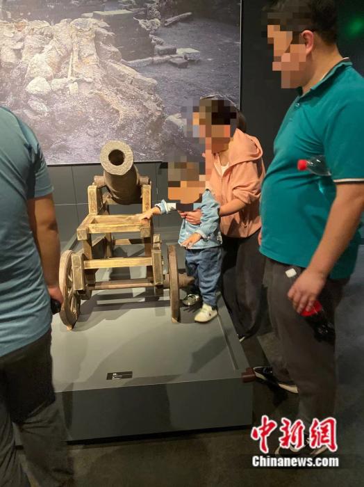 該展區(qū)展示的是明清時期火器等主力兵器,有禁止觸摸標(biāo)識,但由于部分展品未設(shè)置圍欄,游客隨手可以觸碰到藏品,甚至有家長抱著孩子與藏品“親密接觸”。此外,現(xiàn)場還有游客大聲喧嘩的情況。