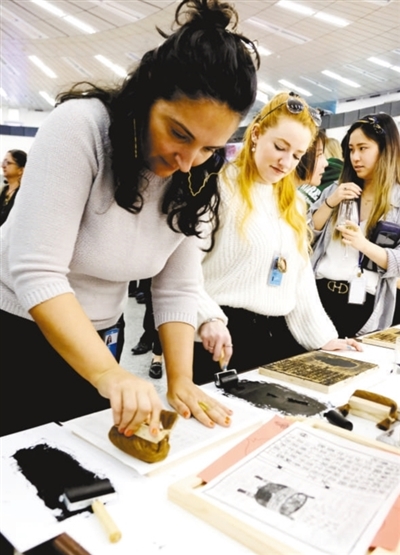 參觀者在體驗(yàn)中國(guó)傳統(tǒng)拓印。