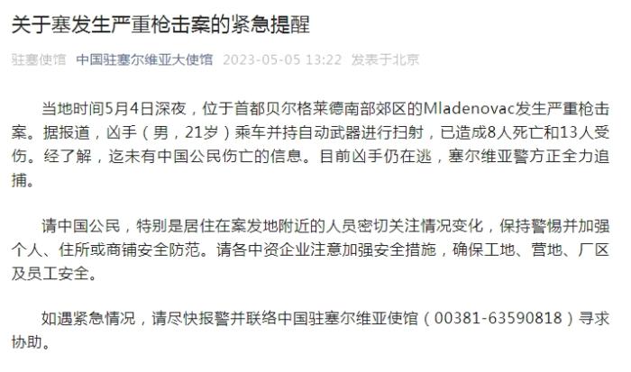 中新網(wǎng)5月5日電 據(jù)中國駐塞爾維亞大使館微信公眾號消息,當(dāng)?shù)貢r間5月4日深夜,位于首都貝爾格萊德南部郊區(qū)的Mladenovac發(fā)生嚴(yán)重槍擊案。據(jù)報道,兇手(男,21歲)乘車并持自動武器進行掃射,已造成8人死亡和13人受傷。經(jīng)了解,迄未有中國公民傷亡的信息。目前兇手仍在逃,塞爾維亞警方正全力追捕。