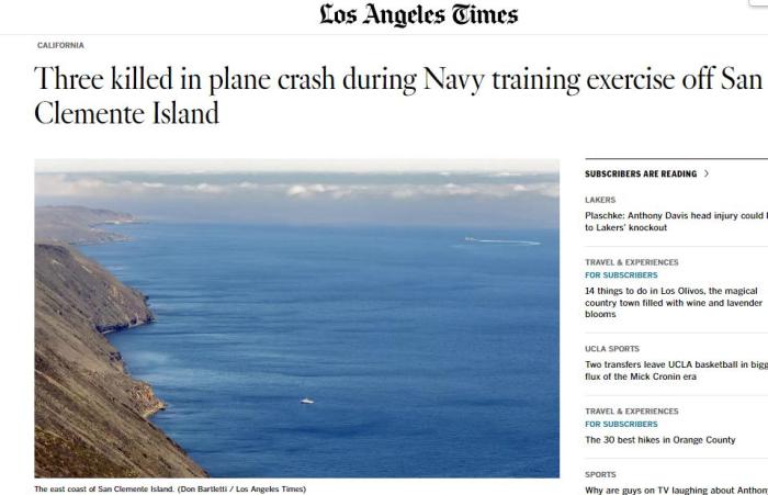 報道稱,其中一架載有三人的“利爾”噴氣式飛機從穆古角海軍航空站起飛,后與空中交通管制員失去聯(lián)系。美國海岸警衛(wèi)隊發(fā)言人李維·里德(Levi Read)隨后證實,這架飛機于10日上午7時55分左右墜入太平洋。另一架飛機安全著陸。