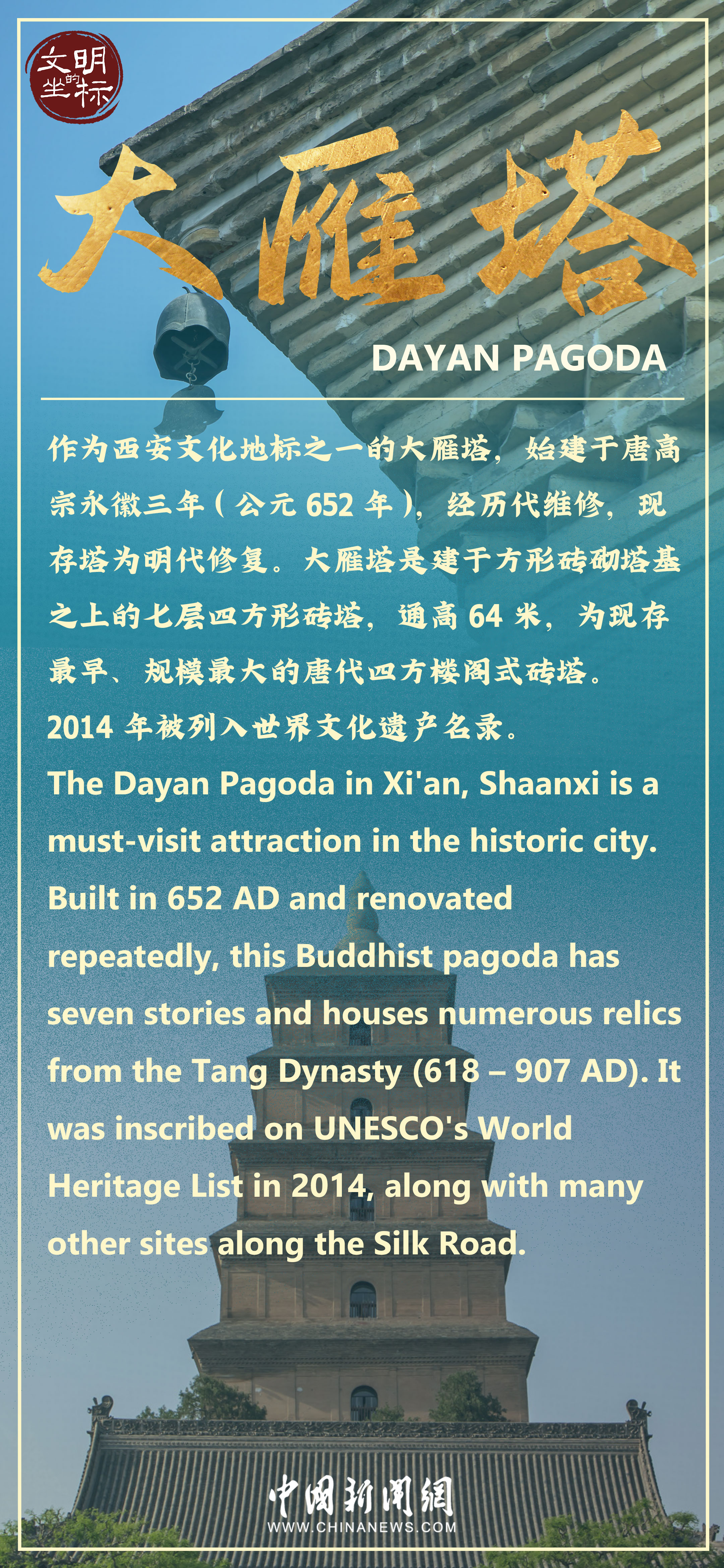 大雁塔又稱大慈恩寺塔,位于陜西省西安市雁塔區(qū),始建于唐高宗永徽三年(公元652年),為七層四方樓閣式磚塔。大雁塔現(xiàn)塔身通高64米,是為保存玄奘法師經(jīng)絲綢之路帶回長安的經(jīng)卷佛像而建,塔下碑文記述和佐證了大雁塔與絲綢之路佛教傳播的歷史。整個建筑氣魄宏大,莊嚴古樸,是唐代建筑藝術的杰作。走近大雁塔,感受“塔勢如涌出,孤高聳天宮”的氣勢,觸摸“曲江流飲,雁塔題名”的歷史文脈。