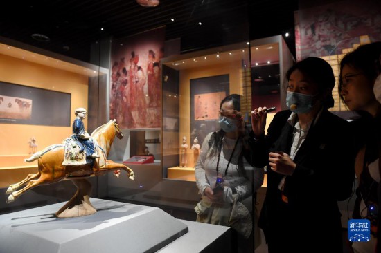 5月8日,游客在西安博物院參觀唐代三彩騰空馬。飛騰的三彩馬上騎有一胡俑,真實(shí)再現(xiàn)了絲綢之路上西域胡人急奔長(zhǎng)安的生動(dòng)形象。
