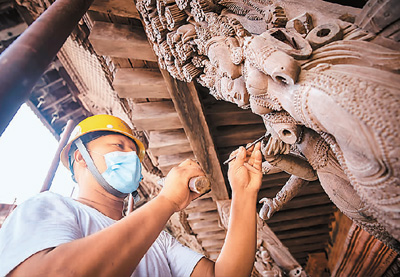 2022年,在國家文物局的指導(dǎo)下,中國文化遺產(chǎn)研究院援助尼泊爾工作隊經(jīng)過近5年努力,圓滿完成尼泊爾加德滿都杜巴廣場九層神廟建筑群文物本體維修。圖為2022年7月,工人在尼泊爾加德滿都進(jìn)行九層神廟建筑群修復(fù)工作。