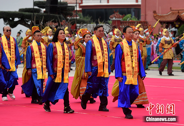 圖為5月12日,吳成典(右二)在福建湄洲島參加癸卯年紀(jì)念媽祖誕辰1063周年大會(huì)暨春祭大典活動(dòng)。 中新社記者 呂明 攝