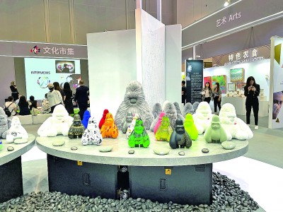 在中東歐展區(qū)的文化市集上,中國與中東歐國家的當(dāng)代藝術(shù)品同臺展出。其中,最吸引參觀者目光的,當(dāng)屬展臺正中擺放的一系列形態(tài)各異的中國藝術(shù)家原創(chuàng)IP形象“大衛(wèi)猿”雕塑或毛絨玩具。創(chuàng)作者袁澤銘介紹,本次展出的“大衛(wèi)猩球”項(xiàng)目邀請包括中國以及波黑、匈牙利、羅馬尼亞等中東歐國家在內(nèi)的全球藝術(shù)家為“大衛(wèi)猿”添加各自獨(dú)特的涂裝,體現(xiàn)了不同國家藝術(shù)家之間的文化交流以及藝術(shù)可能性的碰撞。