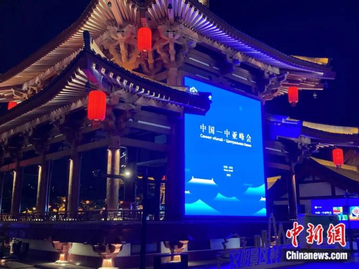 2023年5月11日,西安,曲江池遺址公園夜色闌珊。中國(guó)-中亞峰會(huì)宣傳牌點(diǎn)亮,峰會(huì)即將在西安召開。李溪龍 攝