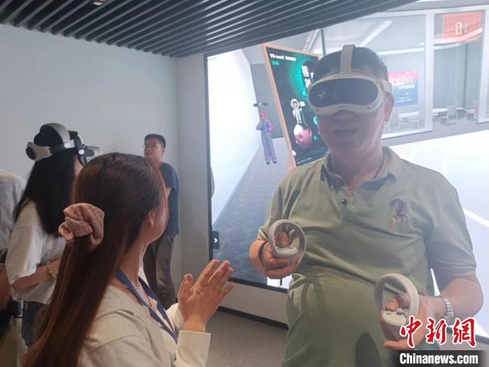 5月16日,體驗者穿戴設(shè)備,在南京維賽客網(wǎng)絡(luò)科技有限公司體驗元宇宙魅力。中新社記者 李夢 攝