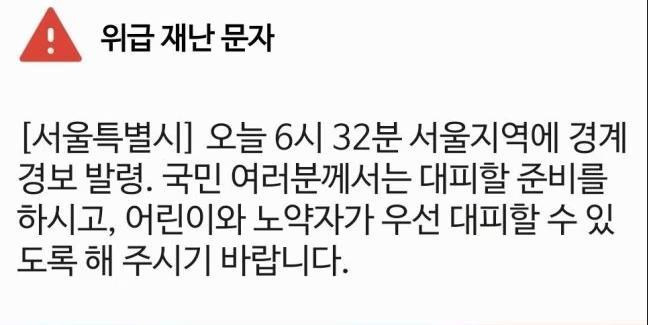 “今天6時(shí)32分首爾地區(qū)發(fā)布警戒警報(bào)。請(qǐng)各位國(guó)民做好躲避準(zhǔn)備,讓兒童和老弱者優(yōu)先躲避。”當(dāng)天清晨,首爾市民收到這條危急災(zāi)害通知,手機(jī)同時(shí)響起警笛聲。