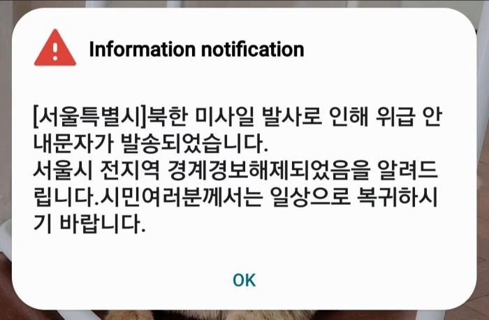 7時(shí)26分左右,首爾市再次發(fā)布通知稱,“由于朝鮮發(fā)射導(dǎo)彈,發(fā)送了危急災(zāi)害通知。在此通知,首爾市整個(gè)地區(qū)的警戒警報(bào)已經(jīng)解除。希望各位市民回到日常生活中去?!?/p>
